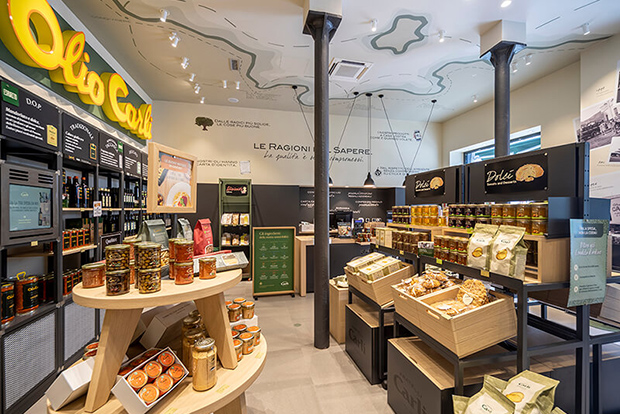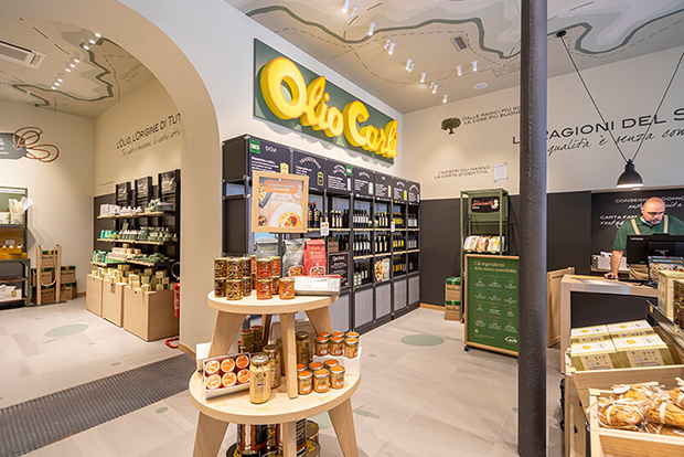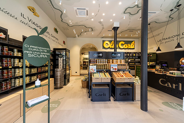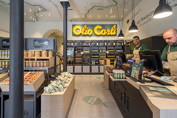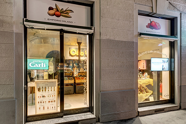 70 Quadratmeter in der Via Marghera – ein Schaufenster an der lebhaften Foodmeile Mailands: das berühmte Öl, alle Produkte und Feinkostkonserven der ligurischen und mediterranen Tradition. Das Emporio Fratelli Carli lädt die Besucherinnen und Besucher zu einer echten Genussreise ein. Das Ladenkonzept ist das in ganz Italien geschätzte: In den Regalen finden sich Olivenöl und natives Olivenöl extra, aber auch Thunfisch, in Öl eingelegtes Gemüse, Oliven, Pesto und fertige Saucen, herzhafte Gemüsekuchen mit saisonalem Gemüse, Saucen, frische und trockene Pasta, eine komplette Bio-Linie, Weine, Essige, Süßes und schließlich Kosmetik und Seifen auf Olivenölbasis.