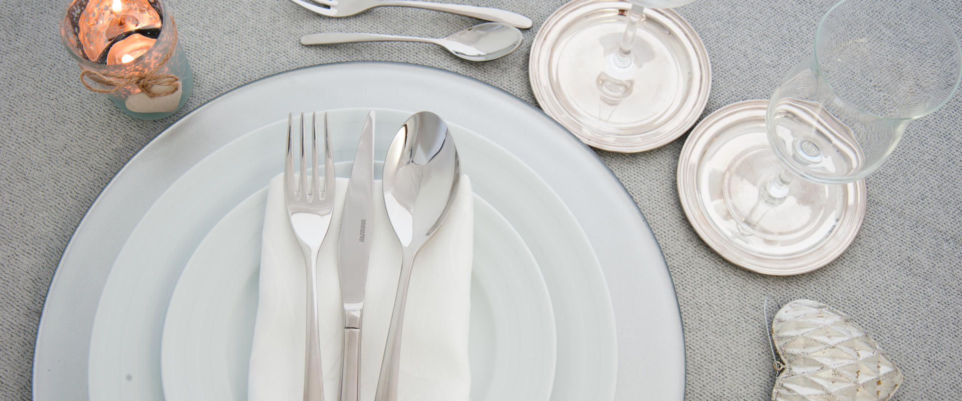 Die Gabeln gehören auf die linke Seite und die Messer rechts, wobei die Schneide zum Teller zeigt. Der Löffel wird rechts neben die Messer gelegt, falls eine Suppe auf dem Menü steht. Die einzelnen Bestecke müssen in der Reihenfolge ihres Gebrauchs angeordnet werden: das Besteck für die Vorspeise liegt ganz außen, das Besteck für die folgenden Gänge immer weiter in Richtung Teller. Das Dessertbesteck gehört über den Teller, es ist aber auch üblich, es beim Servieren des Desserts direkt an den Tisch zu bringen. Übertreiben Sie es nicht mit dem Besteck: weniger ist mehr, auch bei Tisch.