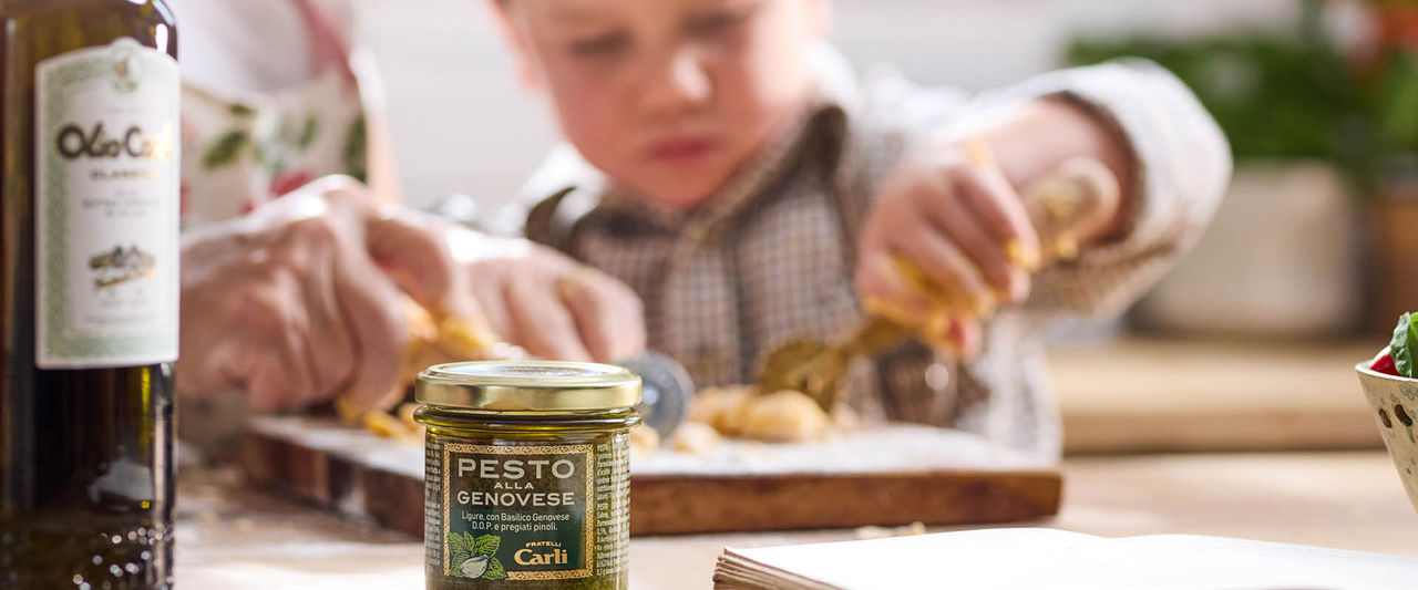 Natives Olivenöl Extra, Genueser Basilikum D.O.P. 13%, Pinienkerne 8%, Milchproteine, Käse 4%, Sahne, Salz, Parmesankäse Parmigiano Reggiano D.O.P. 0,5%, Pecorinokäse Pecorino Romano D.O.P. 0,5%, Knoblauch 0,4%, natürliche Aromen, Säureregulator: Milchsäure, Zitronensäure. Antioxidationsmittel: Askorbinsäure. Enthält Milch.