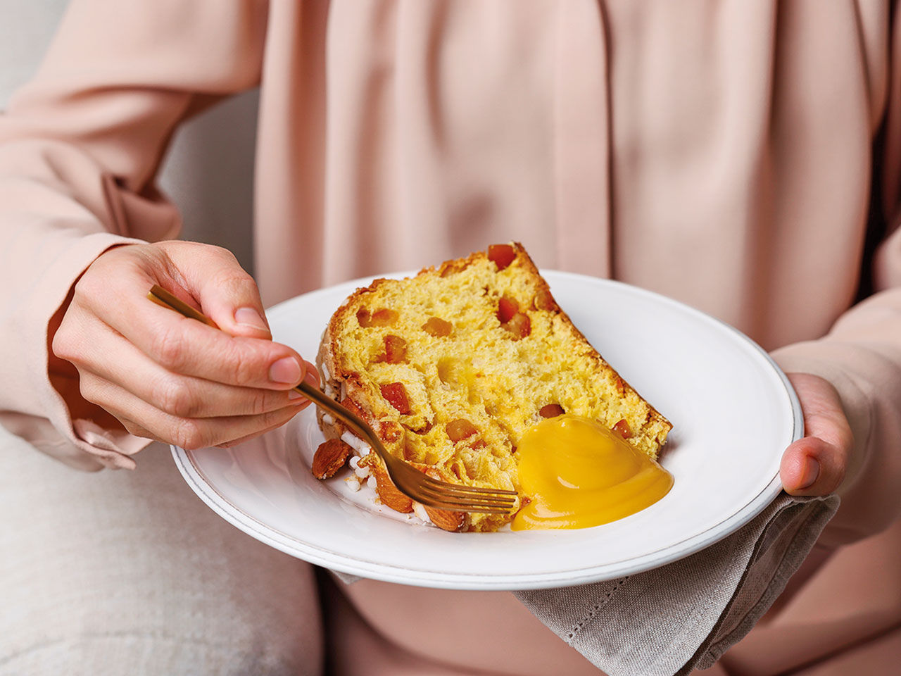 Zutaten des Teigs (83%): Weizenmehl, kandierte Pfirsiche 19 % (Pfirsiche, Glukose-Fruktose-Sirup, Zucker, konzentrierter Pfirsichsaft, natürliches Aroma), Eigelb von frischen freilandeiern, Wasser, natives Olivenöl extra 7 %, Zucker, Natürlicher Sauerteig (Weizenmehl, Wasser), kandierte und gemahlene Orangenpaste (gemahlene Orangenschalen, Glukose-Fruktose-Sirup, Zucker), Honig, Emulgator: Mono- und Diglyceride von Speisefettsäuren, Salz, natürliche Aromen.
